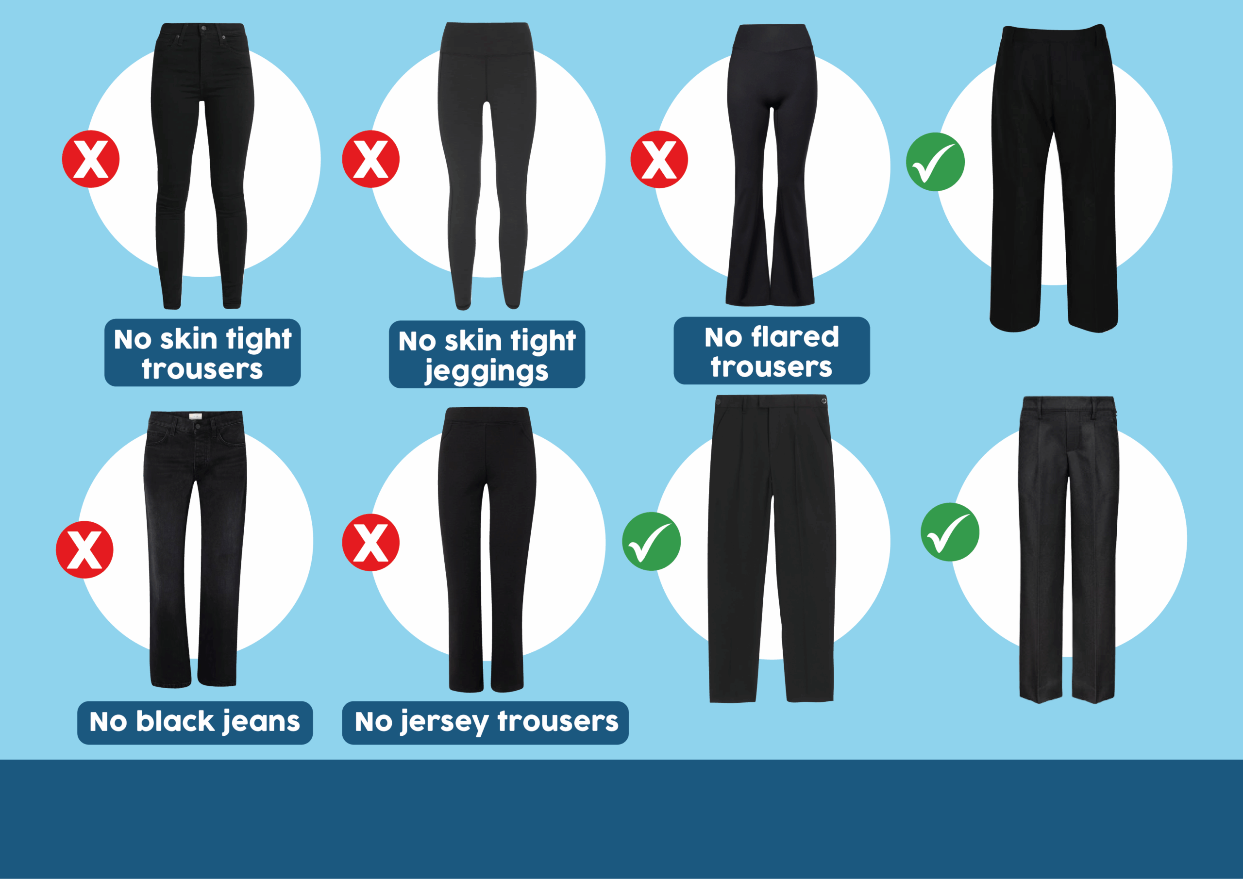 - Black school trousers or black school skirt - optional school emblem (no shorter than 5cm above the knee).